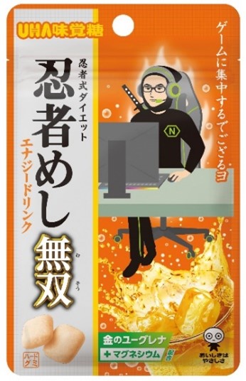 素材の旨味を閉じ込めたハード食感で人気の「忍者めし」より、新味「忍者めし無双 エナジードリンク」が新発売。噛みしめるごとに爽快なエナジードリンクの味が口の中に広がります。第三弾では、さらに無双を追求し「金のユーグレナ ®」に加えマグネシウムを配合。また、手が汚れないのでゲームのお供にぴったり。パッケージは、e-スポーツの世界観を踏襲したデザインと、今トレンドでもあるVR をしている忍者のデザインの2種類。